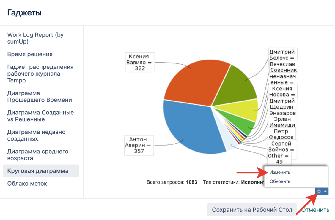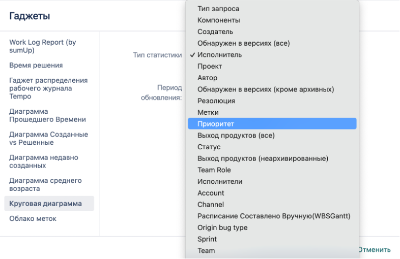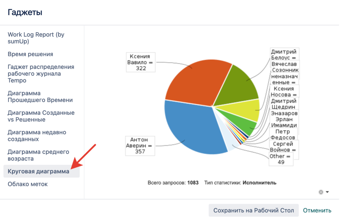 По умолчанию диаграмма строится по Исполнителю, но можно выбрать абсолютно любой доступный тип статистики.